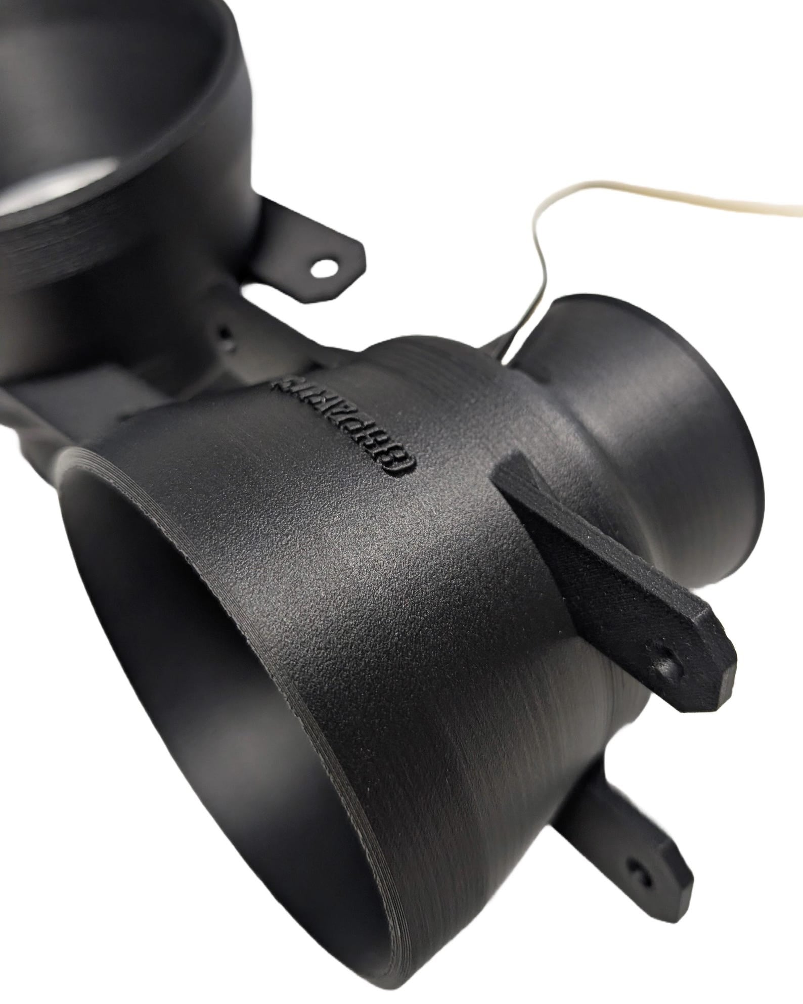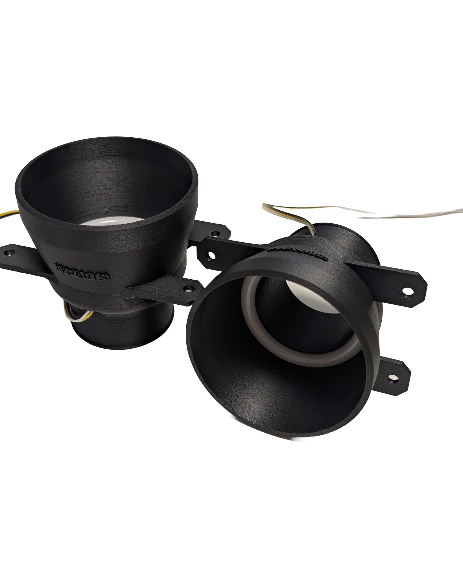 These 3D-printed inserts are a plug-and-play fitment for the original bumper. They bolt to the existing points in place of the OEM fog lights. The funnels feature a hose connection for 60mm hoses. These can now also be optionally ordered with a white/orange halo, which can be used as daytime running lights, indicators, or for other purposes. The funnels come with plug-and-play connectors for the fog lights, where the halos glow white. The orange light can be connected freely.